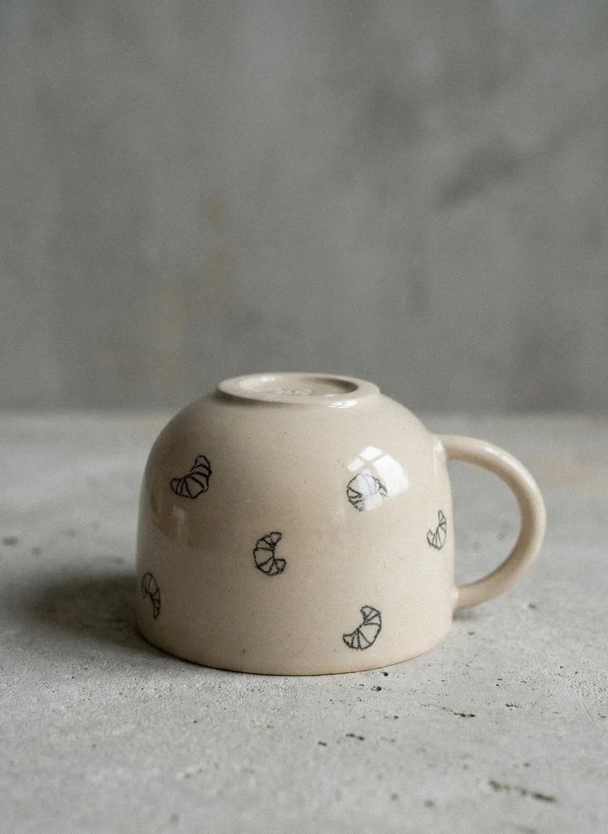 Verspielt, aber nicht aufdringlich. Von Hand gemalte mini Croissants schmücken diese Tasse. Fassungsvermögen: 250 - 300 ml H: ca. 6,5 cm B: ca. 9,5 cm