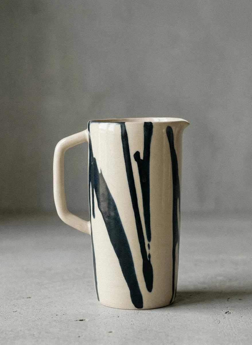Ein mittelgroßer Krug mit individuellem Henkel und natürlich fließendem Streifenmuster. Auch als Vase verwendbar. Fassungsvermögen: 580 ml H: 16,5 cm B: ca. 8cm